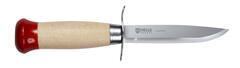Barnekniv.Skaft av bjørk med fingerstopper.Lengde 95mm. Blad av Sandvik 12C27 rustfritt 1-lagsstål. Lengde 90mm. Slire av ekte lær.