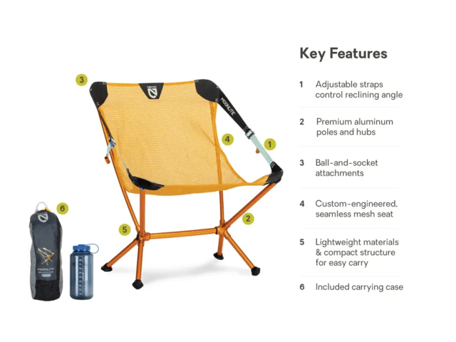 Moonlite has a unique pulley system built into the armrest straps that allows you to easily adjust your sitting position on the fly. Simply pull on the custom buckles and lean back to go from upright at dinner to stargazing after dark. (Pull again while sitting up to return to upright support.)