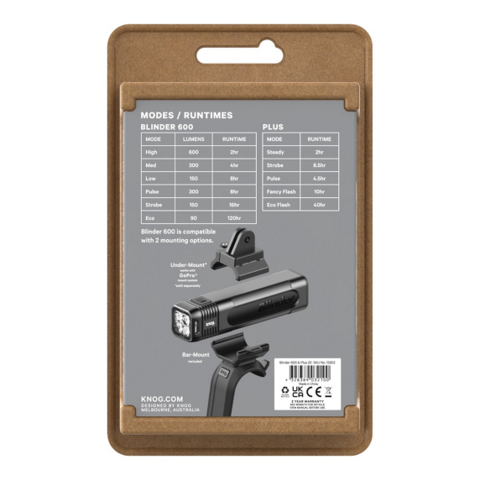 Knog Blinder 600: Enhance your product lineup with the Knog Blinder 600, a compact yet powerful bike light perfect for urban cyclists. Its 600 lumens provide excellent visibility, while the USB-C rechargeable battery ensures convenience. With 6 light modes and up to 120 hours of runtime, this IP67 waterproof light is built for durability and performance.