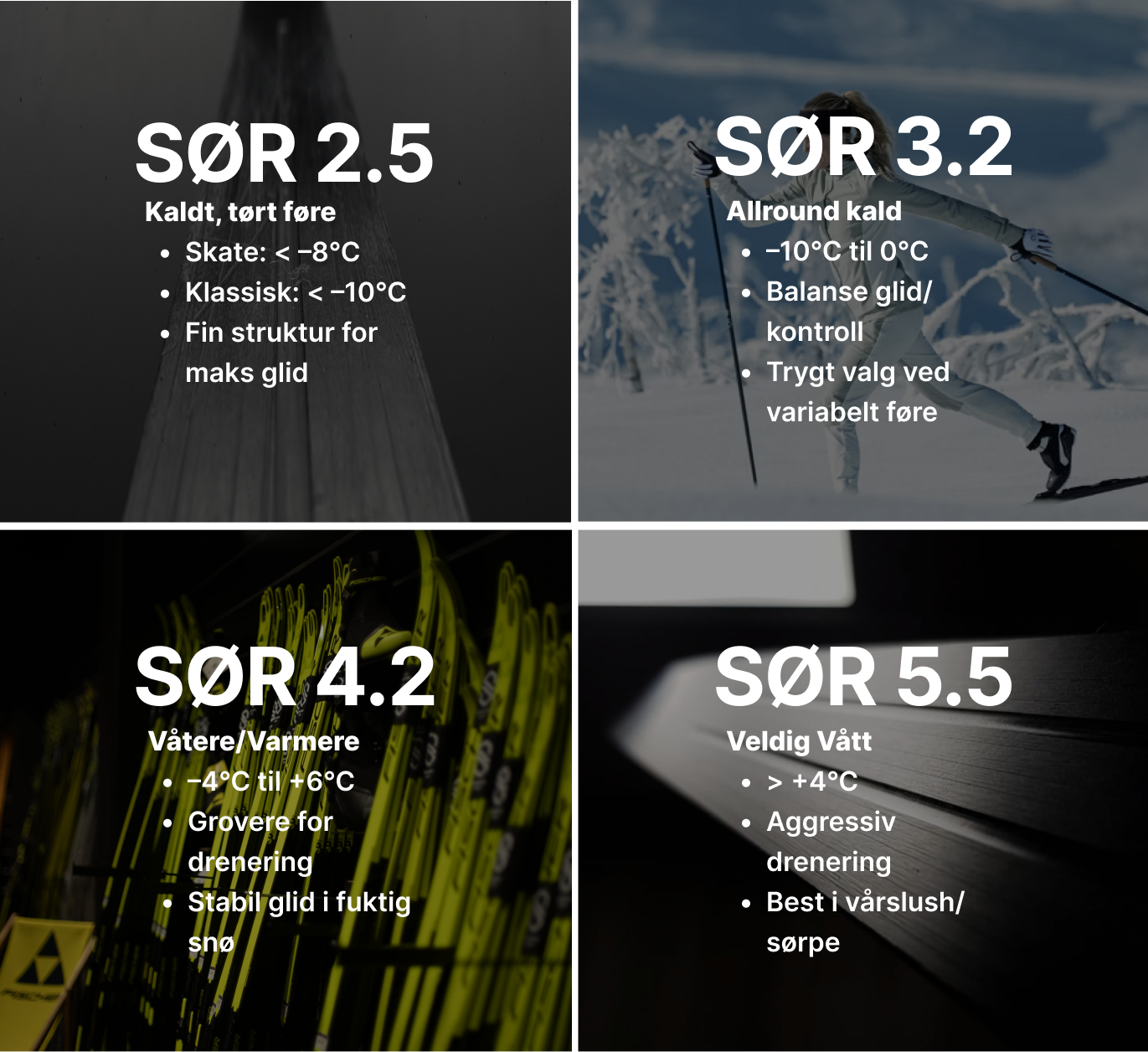 Forskjellige slip-typer fungerer best under ulike forhold – litt som bildekk til sommer og vinter.