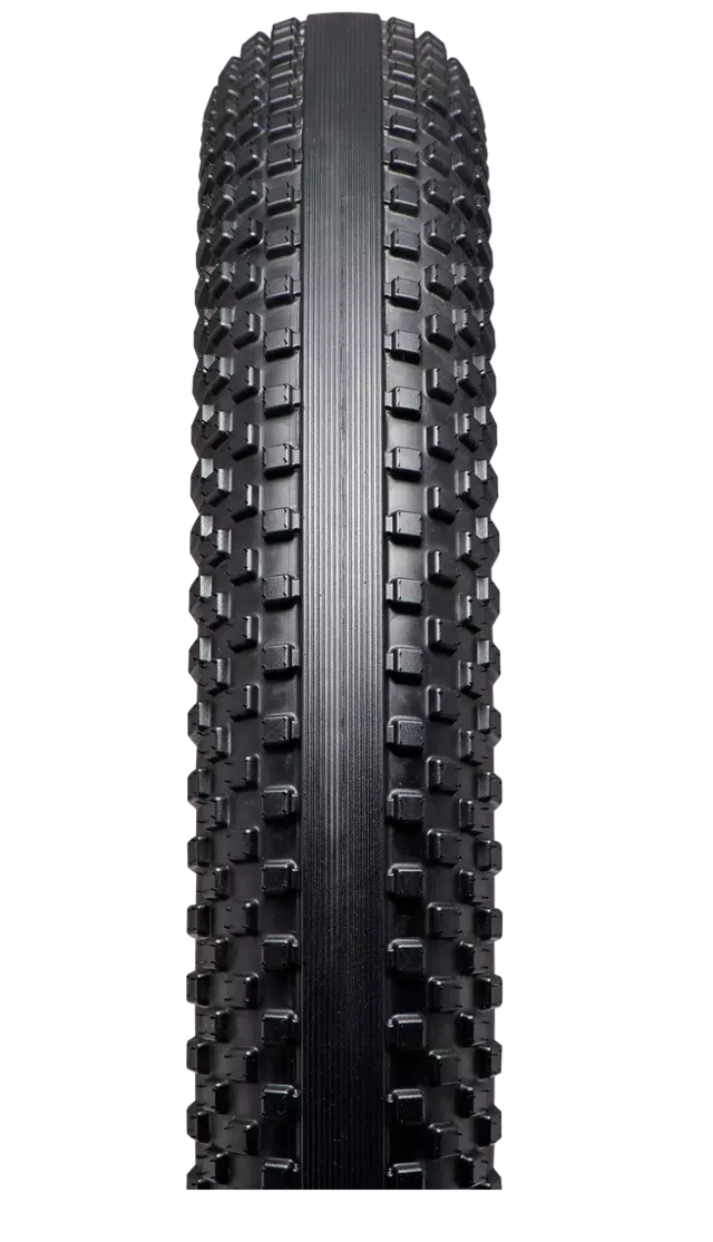 Smooth center tread rolls silently while tall and strong shoulder knobs