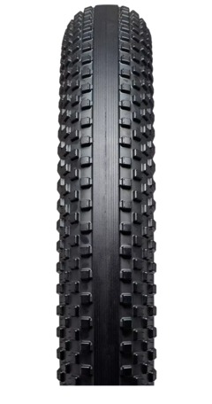 Smooth center tread rolls silently while tall and strong shoulder knobs