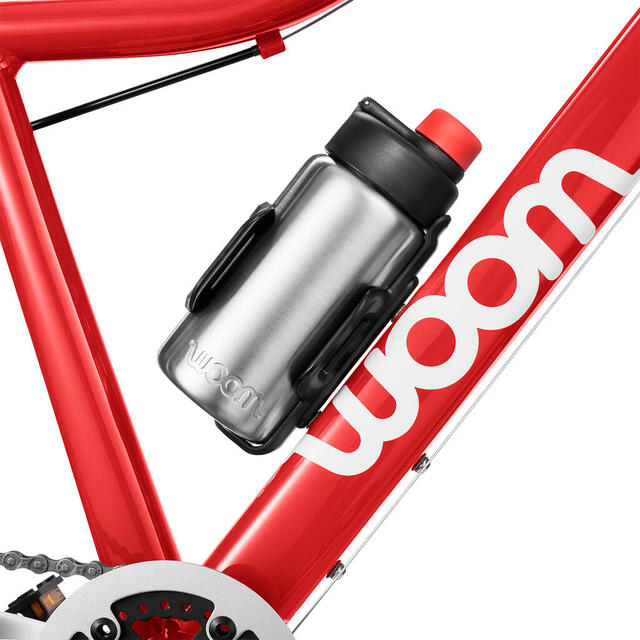 Drikkeflaske i rustfritt stål fra Woom. Flasken er enkel å rengjøre og har lekkasjefritt lokk. Woom Glug leveres med flaskeholder spesialutviklet for barnerammer. Et smart klips gjør det enkelt for barnet å ta flasken ut av holderen.
